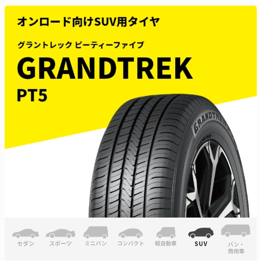 DUNLOP 雪用タイヤ(オールシーズン) DUNLOP GRANDTREK PT5 グラントレック ピーティーファイブ GRANDTREK PT5 グラントレック ピーティーファイブ 幅広いシーンで活躍するオンロード向けのSUV用タイヤとして、 走りの安定性と、ウエット性能をとくに高めました。 表示価格には4本(1台分)のタイヤのはめ替えバランス・廃タイヤ処理 ご希望のお客様は窒素ガス(12月と1月は除く)すべてが含まれています(消費税込み)。 40・45・50・55・60・65・70・80シリーズ ※表示価格は・タイヤ4本(1台分)・工賃廃タイヤ処理・消費税込の現金特価です。 タイヤサイズ 現金特価 245/70R18 111,500円 225/65R18 107,100円 235/65R18 109,300円 265/65R18 132,700円 225/60R18 105,400円 235/60R18 112,400円 265/60R18 130,900円 285/60R18 138,800円 215/55R18 110,700円 225/55R18 111,500円 235/55R18 118,600円 255/55R18 134,000円 215/50R18 115,900円 225/50R18 115,900円 225/55R19 121,400円 235/55R19 129,100円 265/55R19 143,200円 235/50R19 136,600円 265/60R20 158,600円 235/50R20 147,200円 285/50R20 175,800円 255/45R20 202,200円 窒素ガスの無料サービス タイヤの詳細はこちら 他のタイヤの価格はこちら Tweet Share