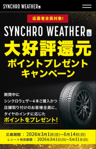 2026.03.10 シンクロウェザーに交換すると、全員もらえます! 3000円相当(14インチ)から 15,000円相当(20インチ)まで 詳しくは画像をクリックしてね。 Tweet Share タイヤの空気圧は気温で変わります 前の記事 品薄の人気タイヤ入荷しました。 次の記事